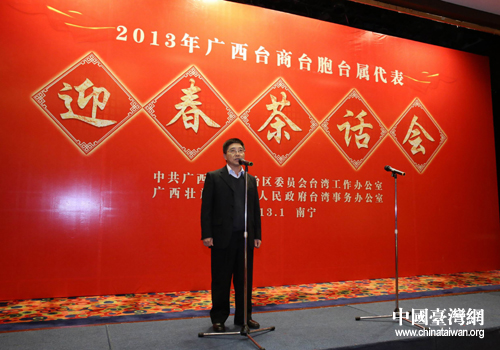 中國臺灣網1月29日南寧消息 1月28日,2013年廣西臺商臺胞臺屬代表迎春茶話會在南寧召開。有關部門代表與全區臺商臺胞臺屬代表歡聚一堂,回顧2012年廣西-臺灣經貿文化全面交流成果,喜迎新春,共敘友誼,共謀發展。