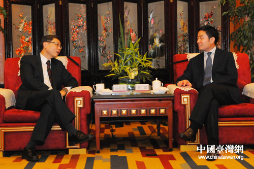 四川省副省長甘霖(右)會見臺灣;鶗倍麻L兼秘書長高孔廉(左)。