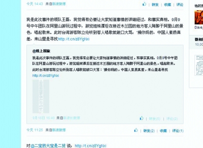 這一事件被報道后,激起了網民的點評。昨日大陸當事游客和領隊認為該臺北市民言論失實,微博上公開發(fā)聲明澄清。文中稱,游客因唱山歌遭28歲臺灣男子陳立倫大罵:中國人滾出臺灣!還夾雜“干你娘”等不堪入耳言辭。王磊(領隊)前去和該男子交涉說:“如果覺得聲音大,我可以跟游客說,你別罵人。”但該男子繼續(xù)出言不遜,打掉王磊手機,并進行了推搡。其間,與該男子同行的一名女游客稱要打官司:“讓你們以后都不能來臺灣。”