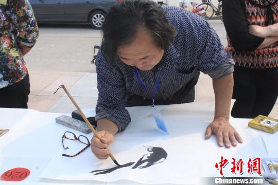 9月29日,海峽兩岸150余名書(shū)畫(huà)家和書(shū)畫(huà)愛(ài)好者在李苦禪藝術(shù)館前共同創(chuàng)作百米書(shū)畫(huà)長(zhǎng)卷,表達(dá)對(duì)美好生活的熱愛(ài),迎接即將到來(lái)的第十屆中國(guó)藝術(shù)節(jié)。圖為,臺(tái)灣水墨畫(huà)大師李奇茂創(chuàng)作書(shū)法作品。 楊曉衛(wèi) 攝