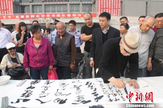 9月29日,海峽兩岸150余名書(shū)畫(huà)家和書(shū)畫(huà)愛(ài)好者在李苦禪藝術(shù)館前共同創(chuàng)作百米書(shū)畫(huà)長(zhǎng)卷,表達(dá)對(duì)美好生活的熱愛(ài),迎接即將到來(lái)的第十屆中國(guó)藝術(shù)節(jié)。圖為百米書(shū)畫(huà)長(zhǎng)卷創(chuàng)作活動(dòng)現(xiàn)場(chǎng)。 楊曉衛(wèi) 攝