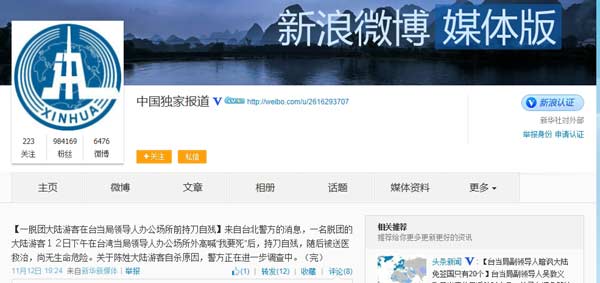 中國獨家報道:【一脫團大陸游客在臺當局領導人辦公場所前持刀自殘】來自臺北警方的消息,一名脫團的大陸游客12日下午在臺灣當局領導人辦公場所外高喊“我要死”后,持刀自殘,隨后被送醫救治,尚無生命危險。關于陳姓大陸游客自殺原因,警方正在進一步調查中。