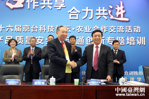 培訓會上還特別舉行了《京臺生物有機資材應用試驗推廣合作項目》簽約儀式,北京北菜園農產品產銷專業合作社與臺灣酪多精生物科技公司達成合作意向。(中國臺灣網 楊麗 攝)