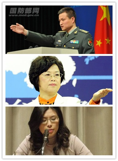 從上至下:國防部發言人楊宇軍、國臺辦發言人范麗青、臺灣行政主管部門發言人鄭麗文。(合成圖)