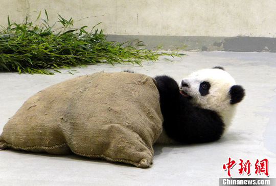 資料圖:“圓仔”在玩“新玩具”抱枕。臺北市立動物園 供圖