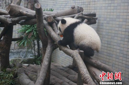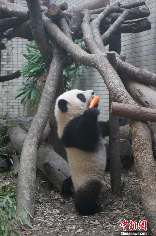 8日,臺北市立動物園公開了一組充滿情趣的照片,再現“圓仔”跟媽媽的一場“和平紅蘿卜之役”:這天是“圓圓”和“圓仔”到戶外活動場郊游的日子,早上“圓仔”量過體重后先到,它叼起活動場上唯一的1個紅蘿卜,努力地爬上棲架,正要坐下來準備“啃”紅蘿卜,但見做完檢查趕到活動場的“圓圓”,一個箭步就走上棲架,瞬間就將“圓仔”口中的紅蘿卜拿走,背對“圓仔”坐下來吃紅蘿卜。“圓仔”沒有哭鬧,自己找其它東西玩,讓媽媽享用胡蘿卜早餐。(記者 董會峰 葉小剛)