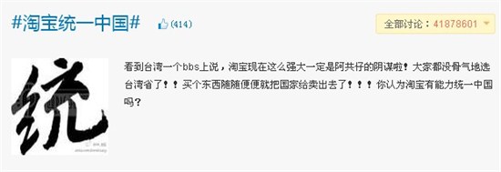 該話題也引發(fā)大陸網(wǎng)友的關注。12日,“淘寶統(tǒng)一中國”成為微博的熱門話題。截至13日8:25,觀察者網(wǎng)編輯看到“淘寶統(tǒng)一中國”話題下已經(jīng)有4187萬條討論。