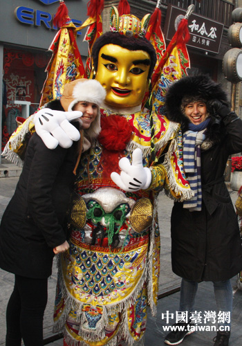 活動中,外國游客興奮的與電音三太子合影。(中國臺灣網 郭慶娜 攝)
