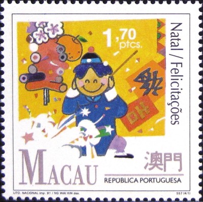澳門1991年11月29日發(fā)行一套4枚《祝賀》郵票,其中一枚中式打扮的男童燃放鞭炮(圖②),背景可見桃花、年橘、倒貼的“福”字和印有“吉”字的利是封,洋溢著濃郁的過年氣氛。