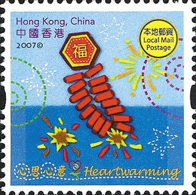 香港2007年12月28日推出的一套4枚《心思心意》郵票,有一枚直接以一掛燃放的鞭炮為主圖(圖③),鞭炮上端還印著一個大大的“福”字,構(gòu)圖簡潔明了,寓意深刻。(文/司徒一凡)