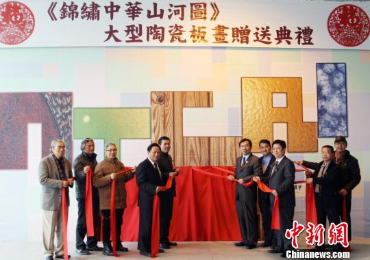 為充分展示當(dāng)代陶瓷技藝,由著名瓷都景德鎮(zhèn)將《錦秀中華山河圖》燒制成大型陶瓷版畫,規(guī)格為2.6米乘以1.2米,是迄今大陸陶瓷燒制藝術(shù)頂峰的最佳表現(xiàn)——最大規(guī)格。陶瓷版畫《錦繡中華山河圖》共兩塊,一塊由大陸方面留存,另一塊當(dāng)天贈(zèng)送給臺灣工藝研究中心惠存。