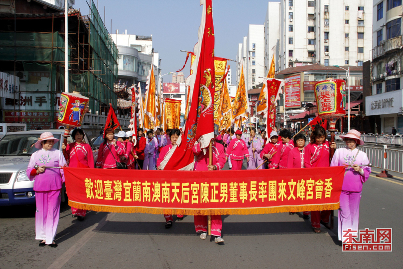 東南網莆田3月26日訊(本網特約記者 蔡建財 林美梅 文圖)3月25日上午,晴空萬里,陽光明媚,臺灣宜蘭南方澳南天宮陳正男董事長率420人媽祖進香團來莆田文峰天后宮進香朝圣。據悉,該宮曾多次組團來朝圣,本次規模最大。市區文獻東路上,文峰宮組織執事隊伍恭迎臺灣南天宮進香團進行繞境活動,吸引眾多市民駐足觀看,現場鑼鼓喧天熱鬧非凡。進香團成員經文峰宮宮前頻頻向媽祖獻禮。通過本次朝圣,增進臺灣宜蘭南方澳民眾對大陸的了解,提升了兩岸人民情誼。