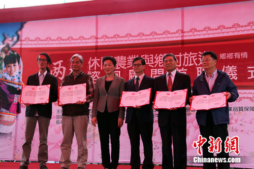 4月1日,“兩岸鄉(xiāng)村休閑旅游嘉年華”在臺(tái)灣苗栗縣飛牛牧場開幕。 活動(dòng)由福建省旅游協(xié)會(huì)、臺(tái)灣鄉(xiāng)村旅游協(xié)會(huì)、臺(tái)灣休閑農(nóng)業(yè)發(fā)展協(xié)會(huì)、臺(tái)灣旅行業(yè)品質(zhì)保障協(xié)會(huì)聯(lián)合主辦。圖為福建方面聘任臺(tái)灣休閑農(nóng)業(yè)發(fā)展協(xié)會(huì)顧問邱涌忠、臺(tái)灣休閑農(nóng)業(yè)學(xué)會(huì)創(chuàng)會(huì)理事長陳昭郎、臺(tái)灣鄉(xiāng)村協(xié)會(huì)理事長鄭健雄等人為兩岸休閑農(nóng)業(yè)與鄉(xiāng)村旅游咨詢顧問,希望專家學(xué)者能夠?yàn)楦=ㄠl(xiāng)村旅游發(fā)展獻(xiàn)計(jì)獻(xiàn)策。(左3)為福建省旅游協(xié)會(huì)會(huì)長朱華。