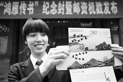 5月10日,位于北京前門的北京郵政“飛魚郵驛”臺灣文化主題郵局推出《鴻雁傳書》紀(jì)念封一套和“鴻雁傳書”、“兩岸一家親”郵資機(jī)戳兩枚。《鴻雁傳書》紀(jì)念封以臺北故宮藏畫“長江萬里圖”為背景,郵資機(jī)戳融入鴻雁、飛魚、帆船及代表臺灣和北京的花朵等元素,表達(dá)出兩岸對文化和情感交流的渴望。圖為一名郵政工作人員展示加蓋了郵資機(jī)戳的《鴻雁傳書》紀(jì)念封。