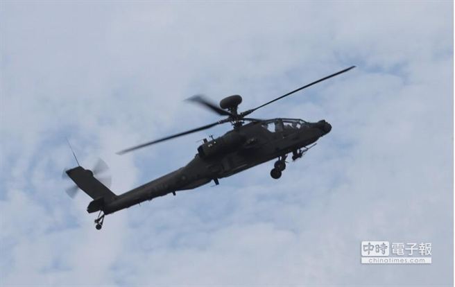 臺方自美采購阿帕奇AH-64E攻擊直升機接機典禮13日舉行,素有“坦克殺手”之稱阿帕奇攻擊直升機展示爬升急轉起飛等項目。 圖片來源:臺灣《中時電子報》