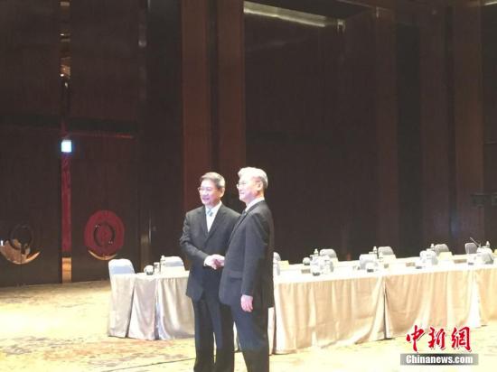 國務院臺辦主任張志軍(左)23日下午在金門,與臺灣方面陸委會主委夏立言(右)舉行會面。中新網發 記者 鄭巧攝