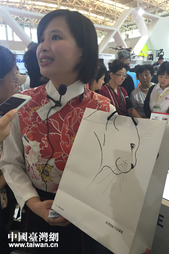 “臺灣精品館”中,展商向大家介紹“石頭做成的紙”。(中國臺灣網 張潔 攝)