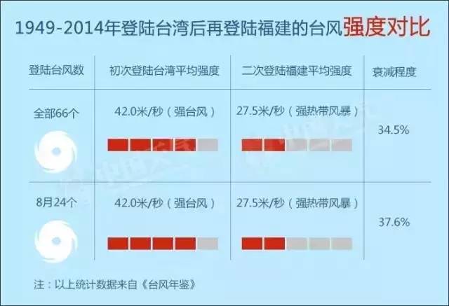 也就是說,近66年來平均每年臺灣幫福建擋一個臺風,阻擋后臺風強度直降兩級——平均強度從強臺風降到強熱帶風暴。如果把臺風看成是格斗游戲選手,超強臺風是五格滿血,強臺風就是四格血,臺風是三格血,強熱帶風暴是兩格血,熱帶風暴是一格血,臺灣基本上能幫福建消耗臺風兩格血。(來源于微信公眾號:看見臺灣)