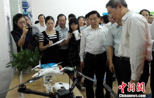 張志軍觀看兩岸青年創業基地無人機。 楊伏山 攝
