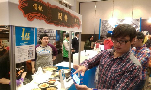 圖為工作人員現場演示如何在臺北夜市中使用支付寶結帳。
