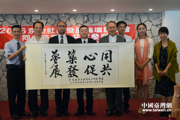 北京海峽兩岸社區發展研究中心贈予臺灣原鄉文化暨社區發展協會一幅寫有“同心筑夢、共促發展”的字畫。 (中國臺灣網 朱煉 攝)