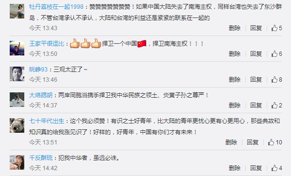 網友@大絡腮胡表示:兩岸同胞當攜手捍衛我中華民族之領土、炎黃子孫之尊嚴!網友a_2070586405在微博下方評論中寫道:只有放寬眼界才談得上胸懷,放眼未來,以大局為重,這才是真正的中華民族的胸懷!