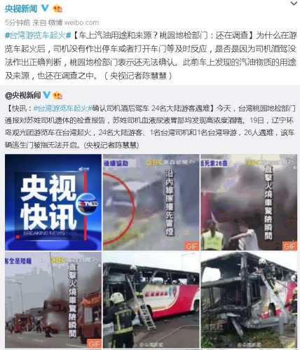 為什么在游覽車起火后,司機(jī)沒有作出停車或者打開車門等及時(shí)反應(yīng),是否是因?yàn)樗緳C(jī)酒駕沒法作出正確判斷,桃園地檢部門表示還無法確認(rèn)。此前車上發(fā)現(xiàn)的汽油物質(zhì)的用途及來源,也還在調(diào)查之中。(央視記者陳慧慧)