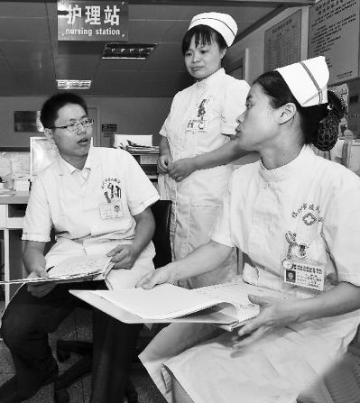陳柏睿醫師(左)在醫院護理站與護士進行交流。(資料圖片)