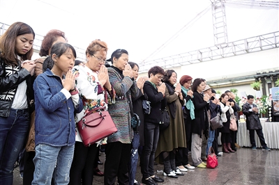 昨日,全國各地趕來參加莊奴先生告別會的歌迷在儀式會場外為莊奴先生祈福送別。 新華社