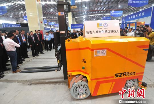 圖為與會領導嘉賓參觀智能車間全向搬運機器人。 張斌 攝