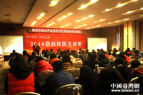 11日下午,在懷柔區雙陽賓館會議中心舉辦了“京臺社區大講堂”主題活動,北京市臺辦綜合處鄧勁松、懷柔區臺辦主任房淑軍、懷柔區委社會工委副書記郭寶新及臺南市的里長們出席活動。與會人員就社區志愿服務、社區低碳節能、社區關懷經驗等等主題作了發言交流。“兩岸一家親”這幾個字,在交流中多次提及,在場社區工作者認為兩岸本就是一家人,希望借助此次活動和京臺基層社區大講堂平臺,繼續深化合作,加強交流,借鑒彼此先進經驗。隨后雙方交換禮品,并合影留念。