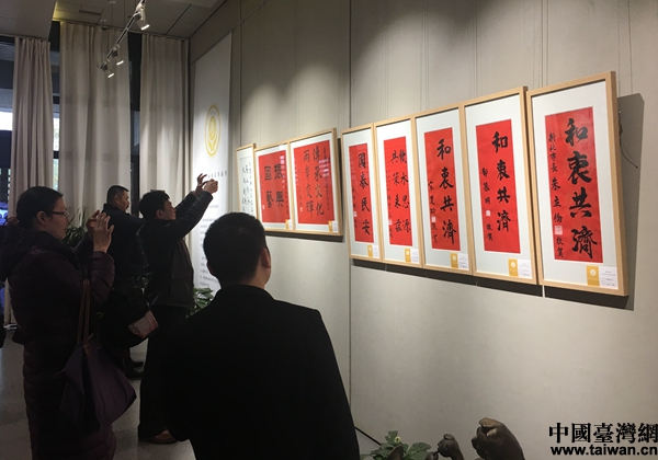 嘉賓為連戰(zhàn)、吳伯雄、朱立倫等人所贈書法作品拍照留念。(中國臺灣網(wǎng) 齊昕 攝)