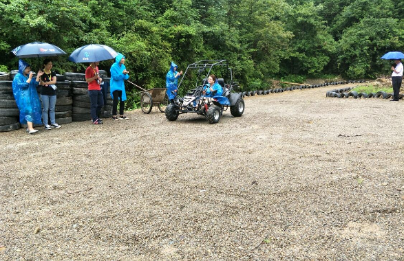 旺龍湖位于龍崗鄉(xiāng)水廟村206國道沿線、日東水庫庫尾。16日下午,采訪團(tuán)記者來到該景區(qū)參觀,景區(qū)內(nèi)停放的幾輛炫酷山地卡丁車,引起了記者濃厚的興趣,并爭相體驗(yàn)。來自北方網(wǎng)的記者駕著卡丁車在碎石跑道上疾馳了兩圈,似乎意猶未盡。她深有感觸地說:“城市開車擁堵,感覺不太好,到這空氣清新的山中來,開著卡丁車有種輕松自如的感覺!