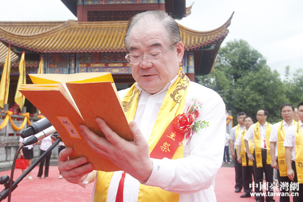 臺灣中華神農大帝協進會創(chuàng)會理事長李乾龍擔任主祭人并恭讀祭炎帝陵文。(中國臺灣網扶海濤 攝)
