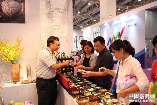 在博覽會(huì)文創(chuàng)產(chǎn)品展覽區(qū),臺(tái)商謝志豐正在忙碌著給參觀者講解自己的產(chǎn)品:釉彩燒。他介紹說:“我們的產(chǎn)品走的是‘釉色'路線,瓷器上的顏色都是將自然物質(zhì)通過高溫進(jìn)行上色,是自然釉的結(jié)晶體相結(jié)合而成的特殊顏色,具有不褪色、對人體無害等特點(diǎn)。我?guī)淼倪@些都是生活陶藝,具有非常高的實(shí)用性。”