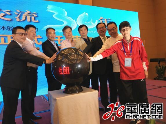 中國華藝廣播公司董事長邱雨(左三)與參加活動的各位領導、專家學者以及臺灣高校社團干部代表一起啟動儀式水晶球。(孟斌 攝)
