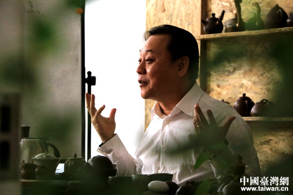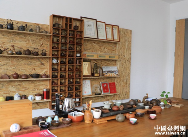 陳炳宏喜歡喝茶,他每到一個地方談成一個項目總要買一把茶壺。在他的會客室中,靠墻的櫥柜上擺著各種各樣的茶壺,每一個茶壺背后都是一個關(guān)于創(chuàng)意的精彩故事。(中國臺灣網(wǎng) 張麗媛 攝)