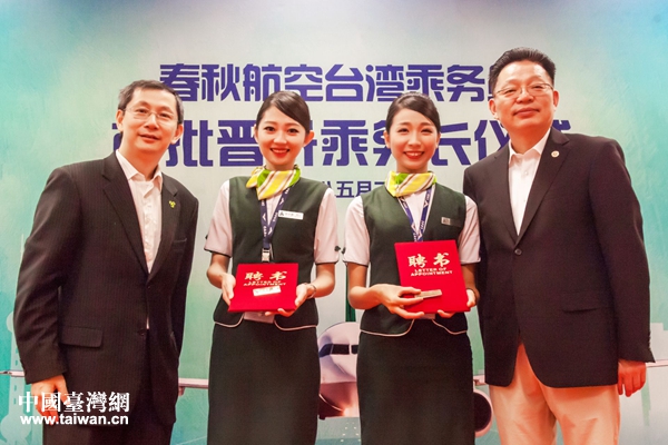 中國臺灣網5月30日上海訊 5月30日,春秋航空公司的兩位臺灣乘務員葉宇晴、黃佳瑩通過晉級考核,晉升為乘務長,她們也成為了大陸首批臺灣乘務長,當天分別率乘務組執飛上海至西安、石家莊航班。春秋航空表示,上海日益成為了臺灣青年第二個家,這是滬臺進一步交流合作結下的碩果,春秋航空將一如既往地打造兩岸青年交流合作平臺,歡迎臺灣青年在大陸就業、生活。