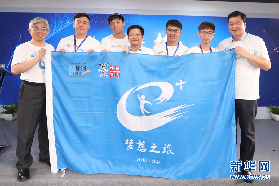 由新華網(wǎng)與臺灣旺旺中時媒體集團共同發(fā)起舉辦的2018“臺灣青年大陸互聯(lián)網(wǎng)+夢想之旅”活動,13日上午在北京啟動。圖為國臺辦新聞局局長馬曉光(左四)與主辦單位負責(zé)人為參加活動的臺灣青年代表授旗。(圖片來源:新華網(wǎng))