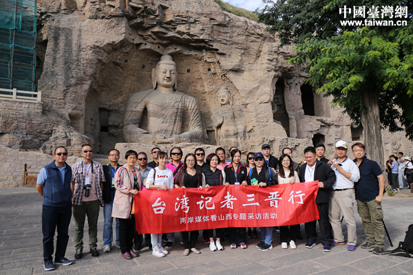 臺灣媒體人于云岡石窟佛像前合影留念。(中國臺灣網 袁楚 攝)