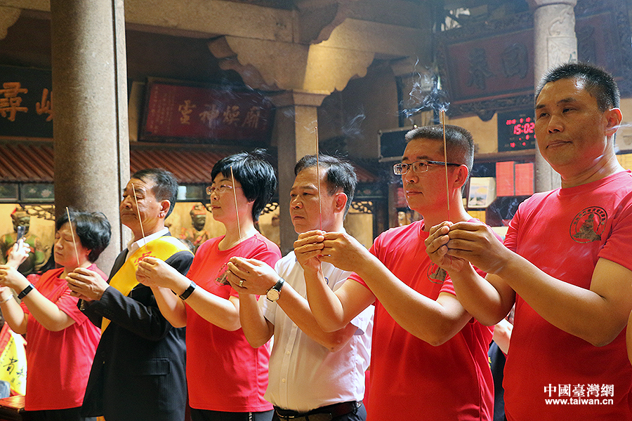 湄洲媽祖祖廟廟方代表陪同長島顯應宮媽祖金身護送團代表向祖廟媽祖進香。(中國臺灣網 何建峰 攝)