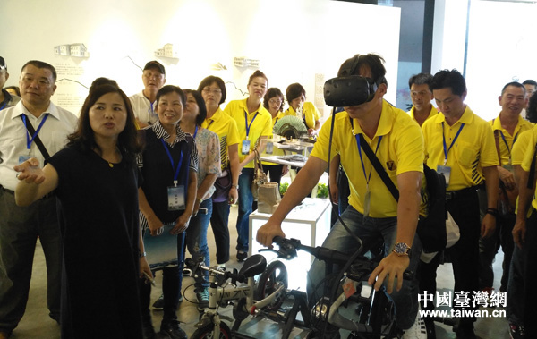 臺灣同胞在莫干山海峽兩岸交流展示館里騎車體驗VR科技。(中國臺灣網(wǎng) 王文英 攝)