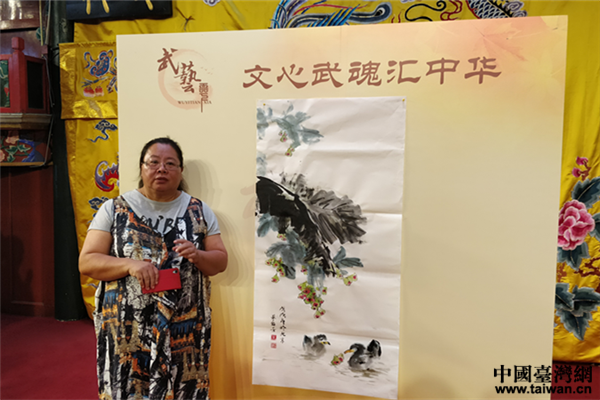 與高風相鄰是來自高雄的水墨畫家蔡梅芳,她同樣以芭蕉葉入畫,畫作中綴滿半紅蓮霧的果樹枝穿葉而出,葉下兩只小鴨圍著掉落的蓮霧果嘻戲謙讓,她說,畫作寓意大陸和臺灣都是一家人,希望大陸和臺灣今后能夠繼續和諧相處,更希望祖國早日統一。