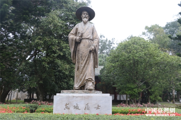 東坡書院內(nèi),東坡笠屐銅像矗立在姹紫嫣紅的鮮花叢中。(中國臺灣網(wǎng) 李寧 攝)