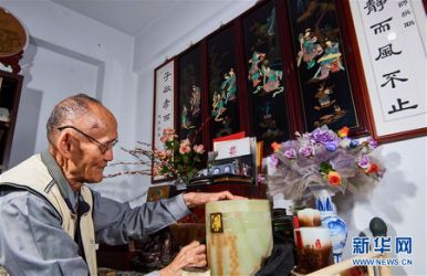 2017年11月14日,高秉涵在擦拭一位老兵的骨灰壇。新華社記者 趙穎全 攝
