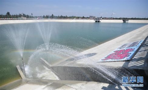 2018年8月5日,來自福建的清水流進金門田埔水庫旁的受水池。 新華社記者 薛玉斌 攝