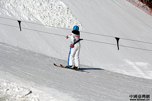 云頂滑雪場(chǎng)教練隊(duì)隊(duì)長(zhǎng)盧永帥為記者展示滑雪技巧。(中國(guó)臺(tái)灣網(wǎng) 賈若瀾 攝)