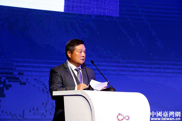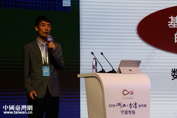 浙江中之杰智能系統(tǒng)有限公司創(chuàng)始人、總裁、寧波騰訊云產(chǎn)業(yè)基地董事長蘇玉學作主題演講。(中國臺灣網(wǎng) 李杰 攝)