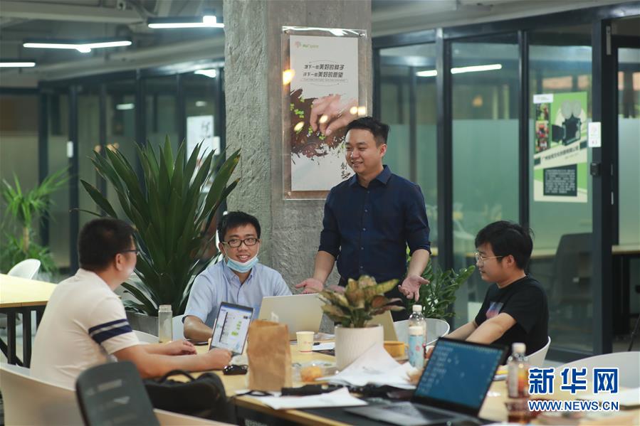 5月18日,陳鴻杰(右)在匯龍臺(tái)港澳青年創(chuàng)新創(chuàng)業(yè)基地與工作人員討論工作。新華社記者盧燁攝