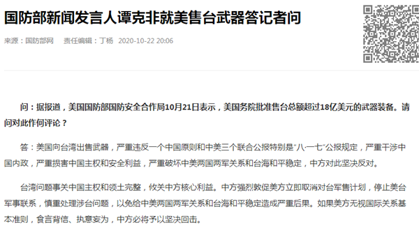 中國臺灣網10月23日訊 國防部新聞發言人譚克非22日就美售臺武器答記者問。針對有記者問:據報道,美國國防部國防安全合作局10月21日表示,美國務院批準售臺總額超過18億美元的武器裝備。請問對此作何評論?